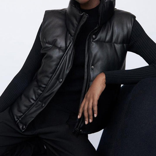New 2021 Autumn Winter Black Warm Faux Leather Vest Women Fashion Zipper Sleeveless Coat Tops Female Casual Short Outwear Ladies